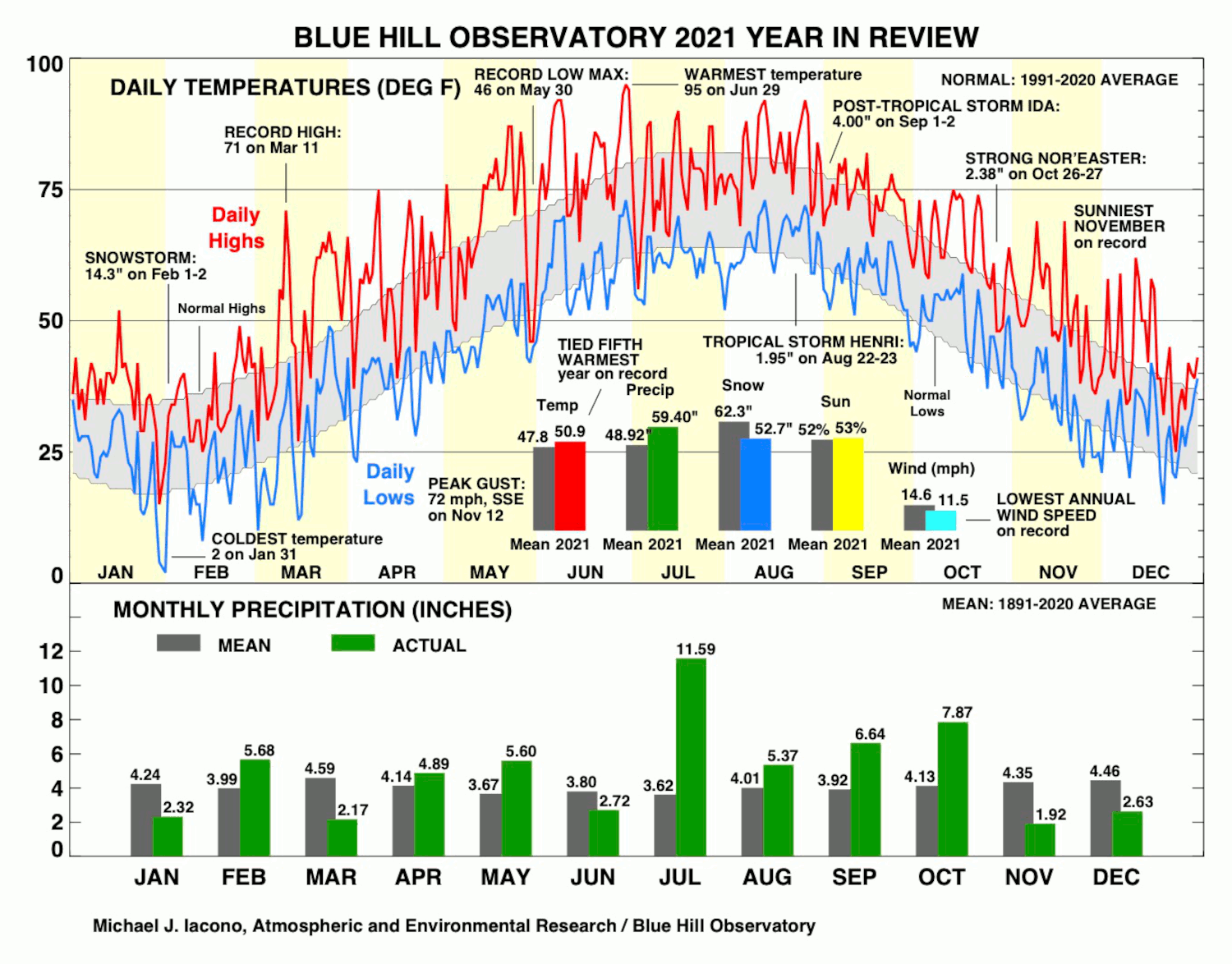 The first half of the year brought near normal precipitation, then about twice the average rainfall was observed from July to October, and the year ended with drier weather during the last two months. The annual total precipitation of 59.40 inches was about ten percent more than the 1991-2020 30-year average. Nearly twenty percent of the annual total occurred in July, which was the second wettest on record with 11.59 inches. There were several significant storms during the year, including the impacts of three tropical cyclones. A large storm in mid-April brought 2.52 inches of liquid equivalent precipitation on the 15th-16th that included 3.6 inches of snow on the 16th that was not only a daily record, but it was the sixth largest snowfall on record this late in the season. A drenching rainfall caused by a strong late season coastal storm brought 3.57 inches of rain on May 28th-31st and temperatures that remained in the 40’s for more than two days. Nearly ten inches of rain fell during the first twelve days of July, which included four calendar days with more than an inch of rain with one of these totaling 3.02 inches on the 9th. Two of these days set new daily records, including 1.49 inches on July 2nd, and 1.98 inches on the 3rd. Rainfall was so frequent during July that there were 24 days with measurable precipitation, which was a new record for July and for any month of the year. Two tropical cyclones contributed to the August rainfall. On August 19th, former Tropical Storm Fred passed to the west of the Observatory as a post-tropical system and brought 0.62 inches of rain and a peak gust to 41 mph from the south. Three days later on August 22nd, former Category 1 Hurricane Henri made landfall near Westerly, Rhode Island. This storm initially brought 0.78 inches of rain during the morning to early afternoon of the 22nd and a wind gust to 47 mph from the ESE in the early afternoon, before moving toward the west. On the following day, the remnant low crossed the area again from west to east and brought an additional 1.17 inches of rain with minimal wind during the evening of the 23rd. Most of the rainfall in September occurred on the first two days of the month, when former Category 4 Hurricane Ida passed New England as a post-tropical storm bringing 4.00 inches of rain between mid-day on the 1st and sunrise on the 2nd along with a wind gust to 49 mph from the ENE early on the 2nd. This 4.00 inch storm total was also the greatest precipitation in 24 hours during 2021. October was also very wet, and most of the October rainfall occurred during three rainfall events, including 2.08 inches on the 3rd-5th, 2.38 inches during a powerful coastal storm on the 26th-27th that also brought damaging winds to eastern Massachusetts and a wind gust to 66 mph at Blue Hill, and 1.69 inches on October 30th-31st.
