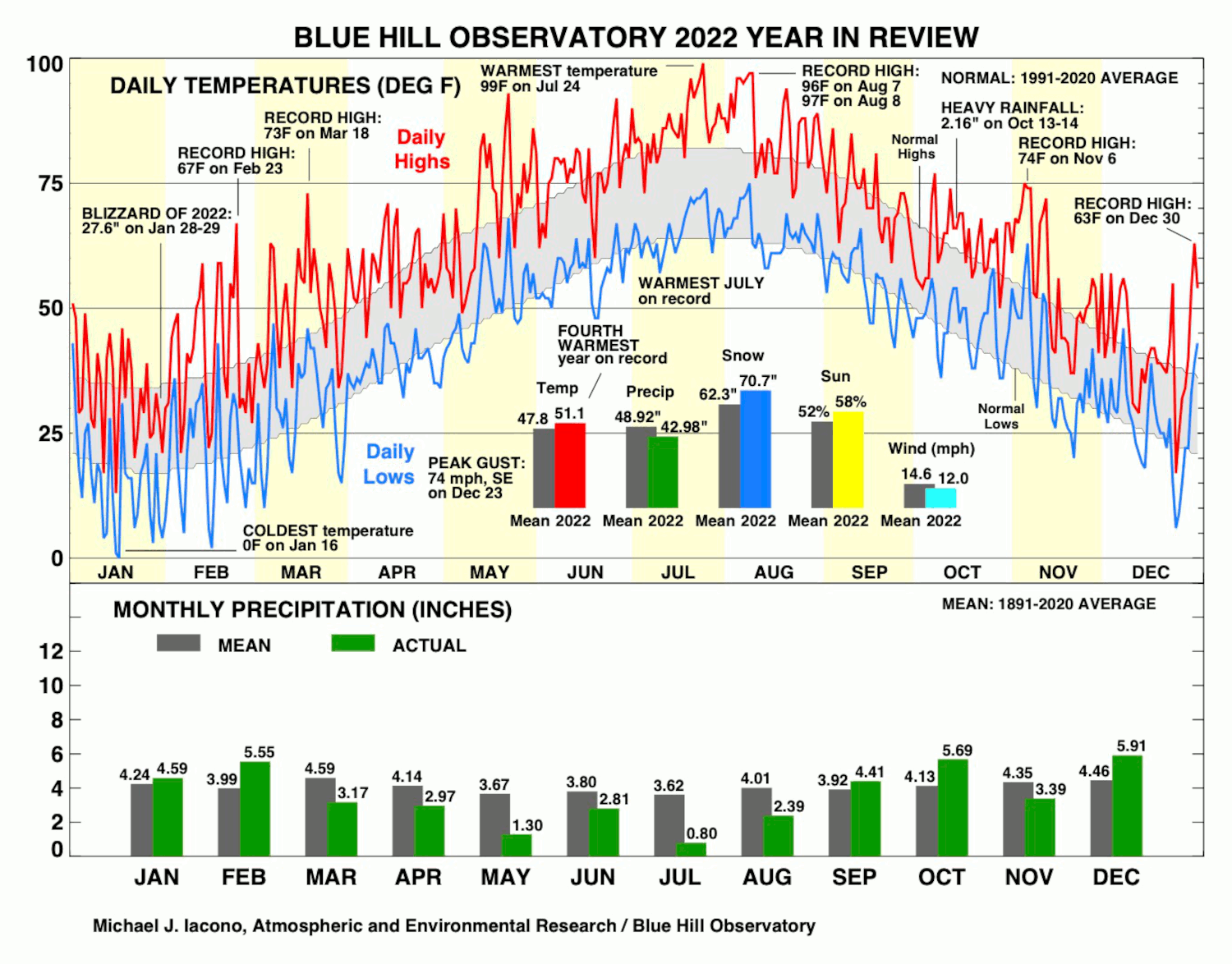 The year started with generally cold and snowy weather in January with two significant snowstorms in that month. Eleven days in January had low temperatures in the single digits, and the lowest temperature of the year was 0F on January 16th. February temperature was more variable with frequent swings between cold and warm from a monthly low of 2F on February 15th to a monthly high and daily record high of 67F on February 23rd, which also tied as the sixth warmest temperature ever measured in February. The warmth continued into the spring months peaking with a daily record tying 93F on May 22nd, the first 90-degree temperature of the year, and March-May was the 5th warmest spring on record. After a slightly warm June, July was the warmest on record with the heat in July peaking in a six-day long heat wave on the July 19th to 24th, which included the warmest temperature of the year and a daily record of 99F on July 24th. A second six-day heat wave occurred on August 4th to 9th with high readings of 97F on the 8th and 9th. These heat waves were among the ten longest ever recorded since 1885, and it was the first time in history at Blue Hill that two heat wave of six days or longer occurred in a single year. Both August and Summer 2022 were the second warmest ever observed, and this exaggerated an extensive period of severe to extreme drought over much of eastern New England this summer. There were 19 90-degree days during 2022, which was 12 more than average, and this number was the most since 20 were observed in 2010. September temperature was closer to average, but warmth returned in October through November, and Fall 2022 was the sixth warmest on record. The last days of October and the first 12 days of November were exceptionally warm including four straight days in the 70s on November 4th to 7th. Both the high temperature of 74F and the low temperature of 63F on the 6th were records for the date, and in terms of the mean temperature of 69F (and the four cooling degree days for the day), the 6th was the warmest day ever observed in November at Blue Hill. December temperatures were more variable from a daily high of 55F on December 23rd to the monthly low of 6F on the 24th, following the passage of a strong Arctic cold front the day before, to the monthly high and daily record of 63F on December 30th to finish the year on a warm note.