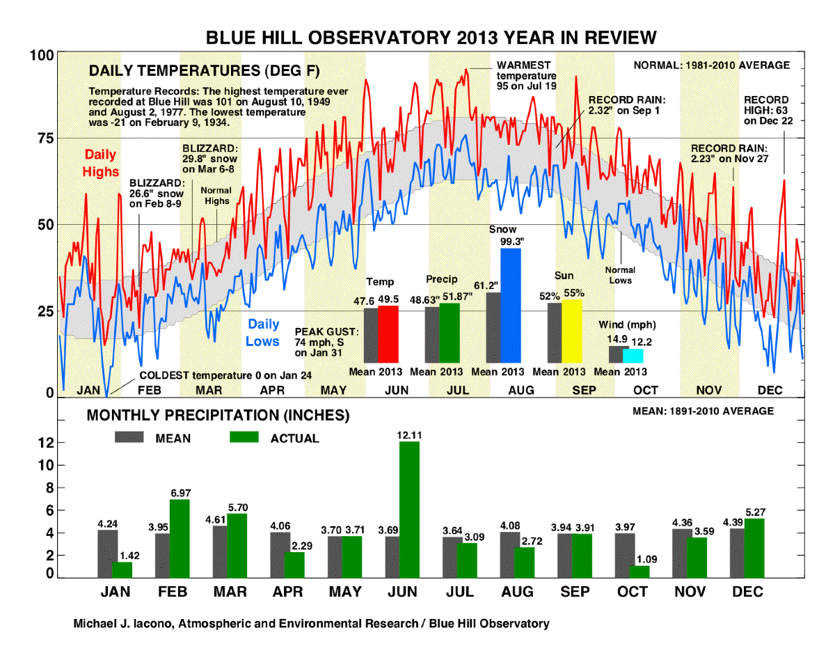 These figures summarize the daily high and low temperatures, the normal temperatures, the temperature extremes, monthly precipitation, annual totals, largest storms and other important weather events for each year.