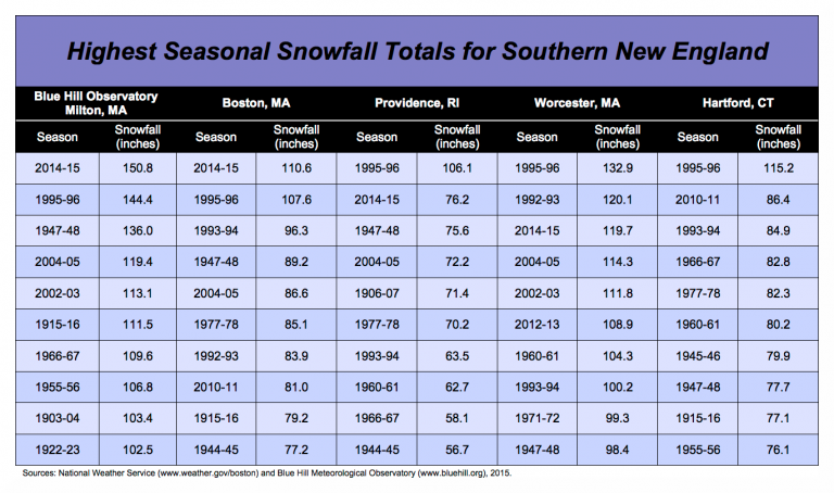 The table below summarizes the ten highest seasonal snowfall totals for several Southern New England locations including the Blue Hill Observatory. The…