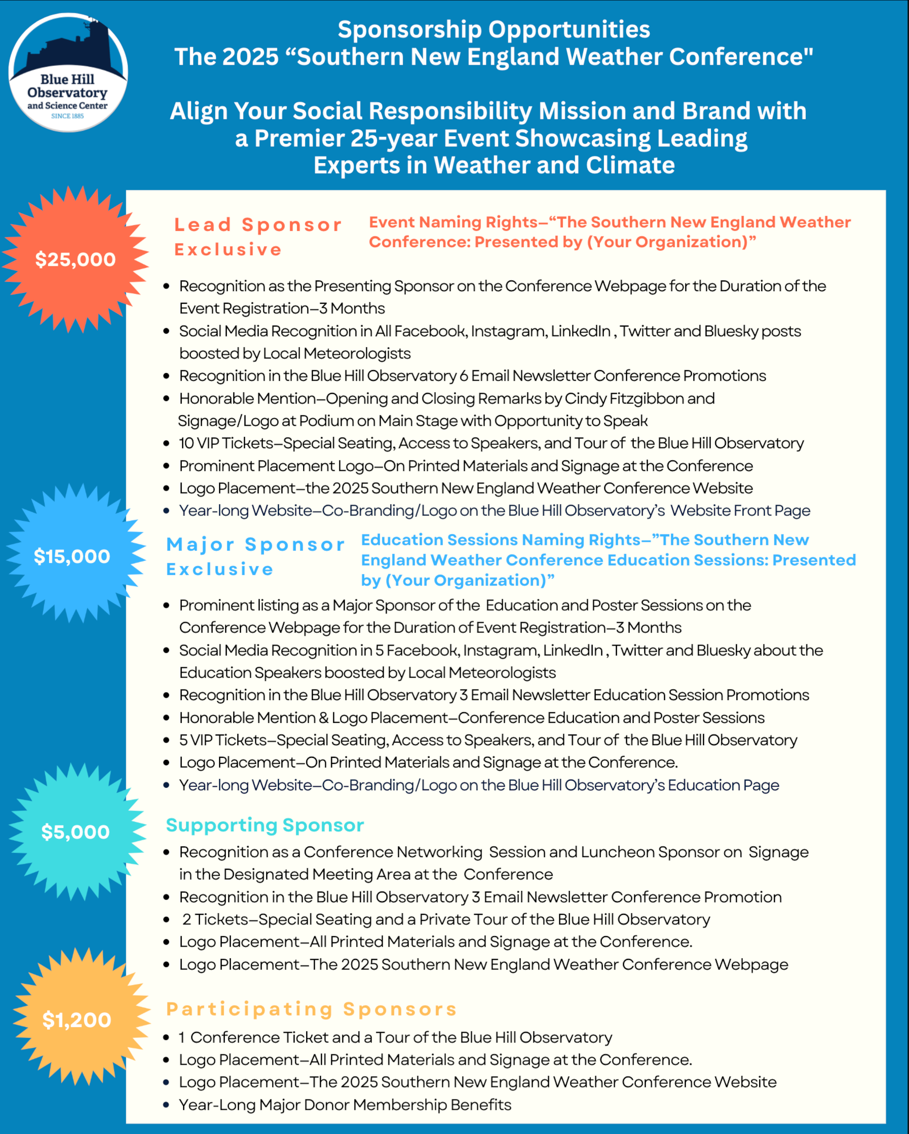 Support the scientific and educational mission of the Blue Hill Observatory and Science Center by sponsoring our annual Southern New England Weather Conference being held this year on