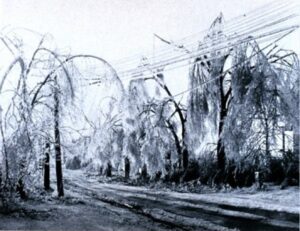 Even the “oldest inhabitant” admits the ice storm of November 26-29 was the worst that has been known in this section. Snow began to fall at 2 P.M. on the 26th and changed to rain at 4:45 P.M. The temperature of wet surfaces remained below freezing and the air temperature fell to 25 degrees in the evening on the 27th with rain and some sleet falling. Freezing rain fell all day on the 28th with an increasing north-northeast wind and temperatures just below freezing. A wild night followed with sleet and freezing rain and wind gusts now taking down tree limbs with vivid flashes of green in the sky as trolley wheels arcing on iced over wires. At sunrise on the 29th a thunderstorm with pink flashes of lightening awakened the people to a scene of destruction. There was upwards of 5 inches of combined snow, sleet, and freezing rain on the ground by Tuesday morning. Ice on 1/4 diameter wires measured 2 inches, weighing 1.3 lbs per foot. Several people were killed by falling limbs.