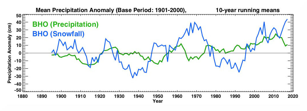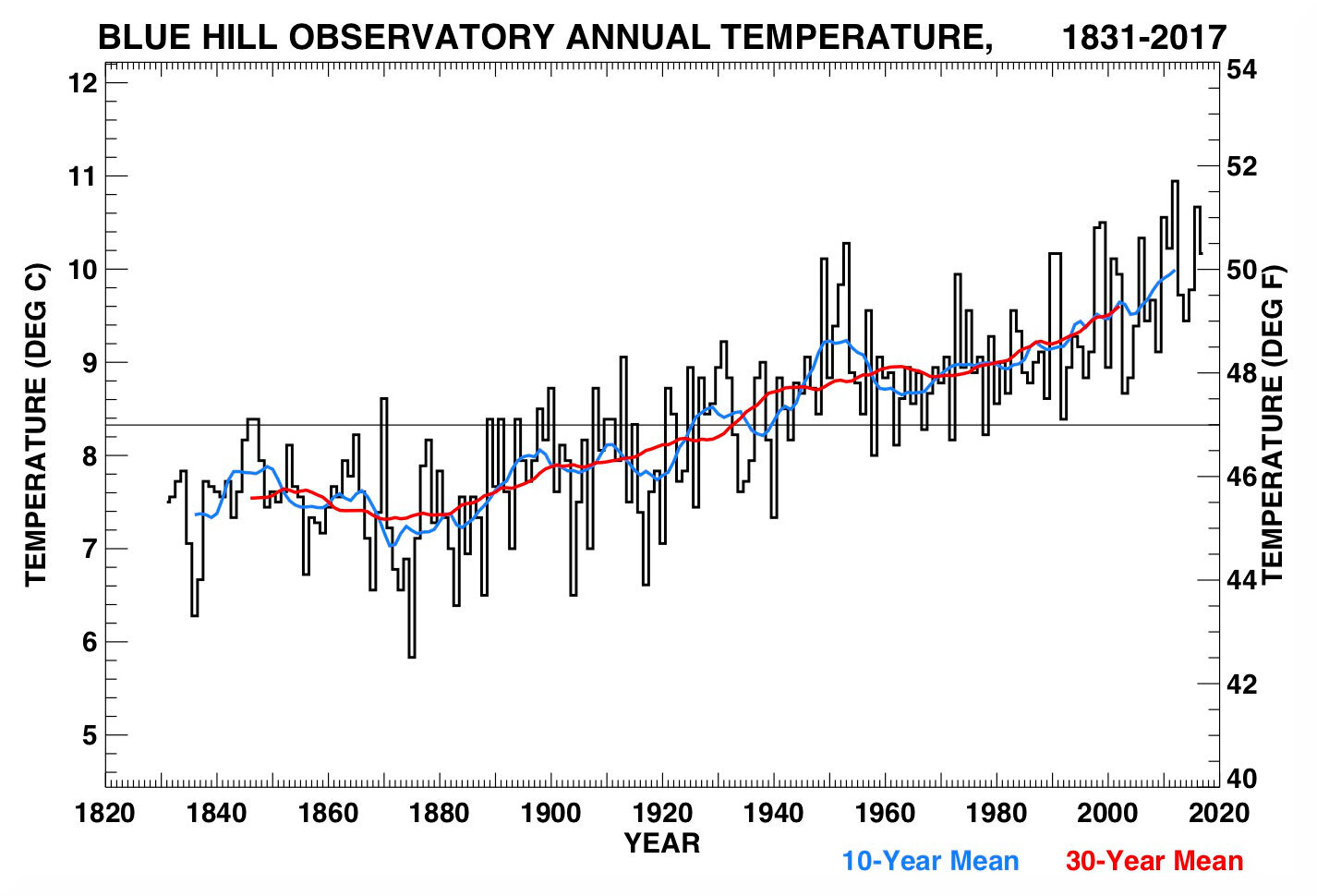 The founding objective of the Blue Hill Meteorological Observatory (BHO) in 1885 was to establish the first private observatory for the measurement of weather and climate at a location that was distinctly elevated above the surrounding terrain and to support special investigations in meteorology. The continual and meticulous recording of temperature, moisture, precipitation, snowfall, wind speed and direction, pressure, clouds, sunshine and many other parameters above the majority of surface obstructions was intended over time to provide a unique perspective of the state of the lower atmosphere and the local weather. Considerable care has been taken to continue the use of traditional instrumentation and observing methods to ensure the highest degree of continuity in the measurements as possible. More than 130 years later, the BHO observations form the longest, most consistent, and most extensive climate record in North America, and they are an irreplaceable resource in support of the BHO mission to advance climate research and public education of atmospheric science.