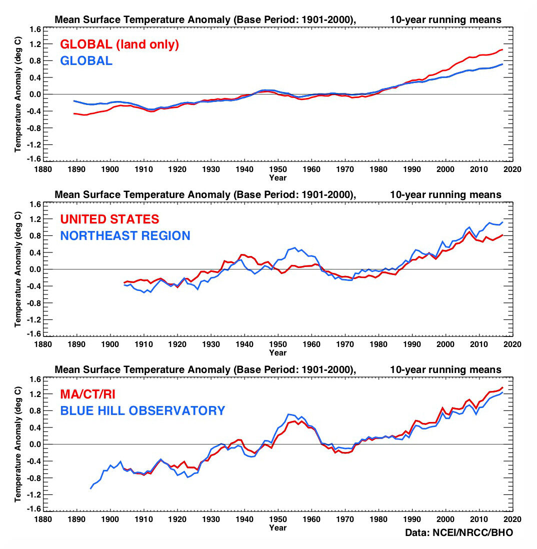 Among the many parameters recorded at Blue Hill, multiple indicators reflect the changes that have occurred at this location over more than a century, though the surface temperature is among the most prominent. The BHO annual mean temperatures since the middle 19th century are shown in black in Figure 1. All data from February 1, 1885 to the present were observed on the summit of Great Blue Hill. Earlier temperatures from 1831 through January 1885 were observed from two nearby valley locations that overlapped with BHO measurements for several years in the 1880’s, which allowed the valley data to be adjusted to the summit location, and these temperature data are shown for historical context. Most of the upward trend since the 19th century was observed directly on the summit. Centered running mean temperatures are also shown for 10-year (blue) and 30-year (red) periods that smooth the data to illustrate decadal scale changes. A linear fit to the annual temperature data over the period 1885 to 2017 indicates a trend of +0.173 °C/decade with a better than 99.9% confidence that the trend is statistically significant.