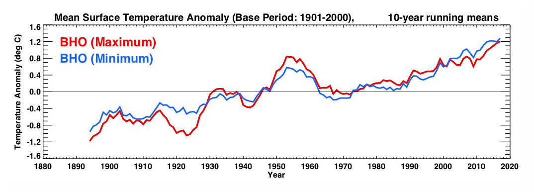 The location of BHO at the 635-foot summit of Great Blue Hill within the 7000-acre Blue Hills Reservation ten miles south of Boston, Massachusetts has provided a relative degree of isolation from the local urban growth over the last century. The extent to which urban warming in the vicinity of Boston and vegetation changes on Great Blue Hill have affected the Observatory climate data has not been fully established. However, these are only two of the complex and overlapping factors on multiple scales that may influence the temperature and other weather parameters observed at BHO.