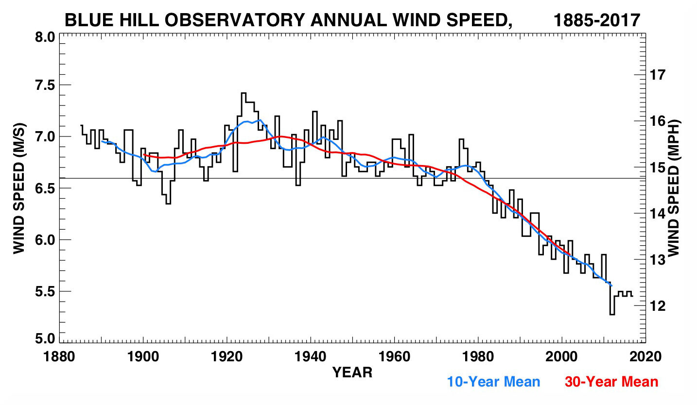 | Figure 5. Annual mean wind speed as measured at the Blue Hill Observatory (black) and plotted as 10-year (blue) and 30-year (red) running means. The straight black line is the full period average. |
